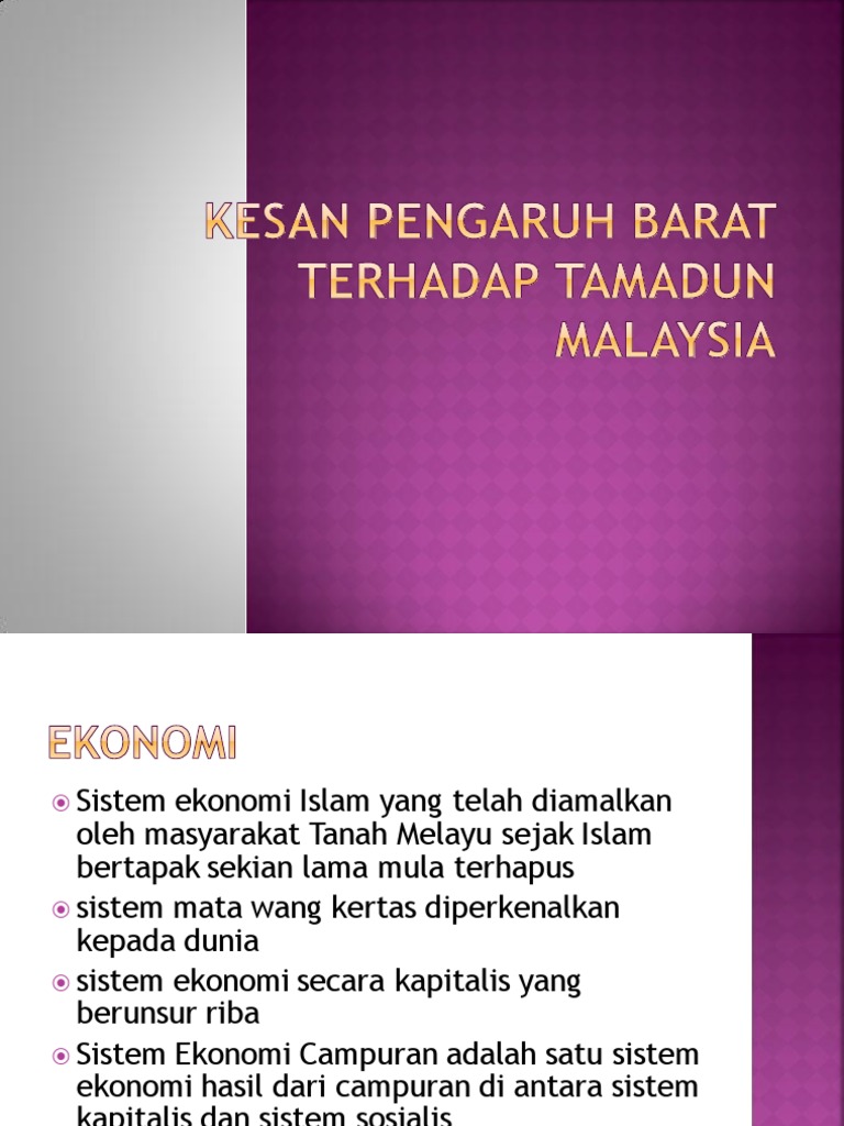 You can also bookmark this page with the URL. Mereka meniru cara pemakaian dan perangai artis-artis tersebut tanpa menghiraukan pegangan agama. KESAN PENGARUH BARAT TERHADAP TAMADUN MALAYSIA Ekonomi Aspek ekonomi ialah negara-negara membangun akan sentiasa bergantung kepada Negara Barat kerana mereka kurang mahir dari segi teknologi dan juga kekurangan tenaga buruh yang mahir.